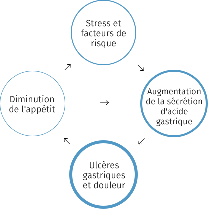 Les ulcères gastriques équins sont causés par un cercle vicieux de stress ou d’autres facteurs de risque, d’acidité accrue, d’ulcération et de baisse d’appétit, qui finit par provoquer un inconfort important pour le cheval.
